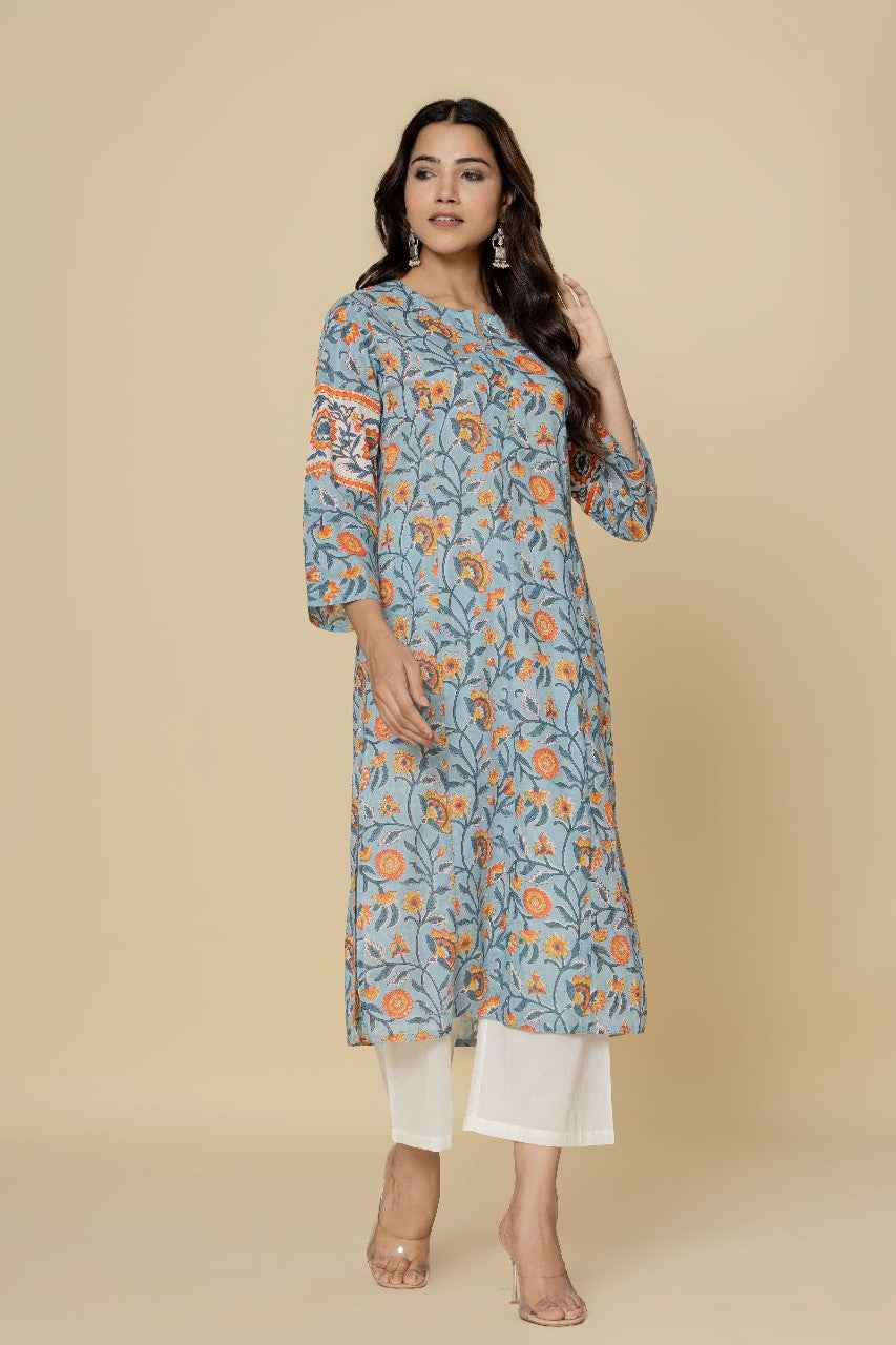 Naksh Blue Floral Printed Straight Kurta