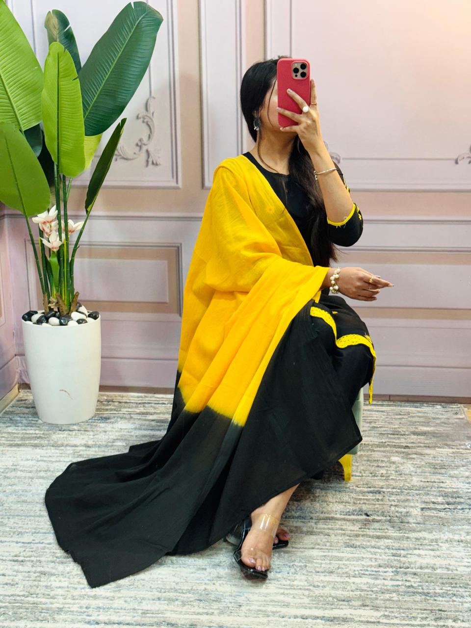 Made from soft cotton fabric, this kurti set ensures all-day comfort. The classic black color, floral embroidery, and lightweight Malmul dupatta together create a refined ethnic look that never goes out of style โ making it a wardrobe essential.