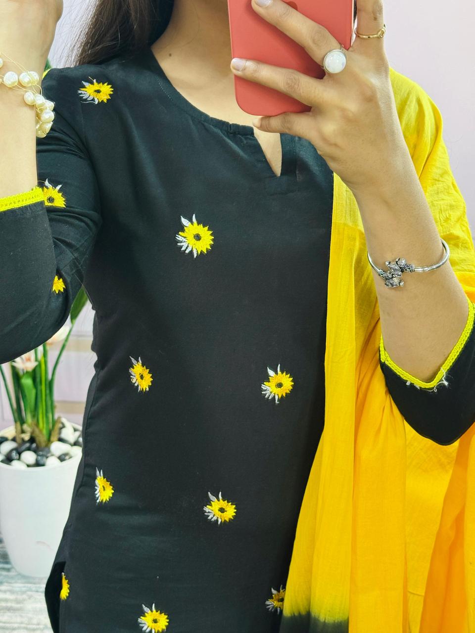 Elevate your everyday ethnic style with the Tritiyaa Black Cotton Embroidered Straight Kurti Pant Dupatta Set โ a timeless 3-piece ensemble designed for comfort, elegance, and versatility. Crafted in breathable cotton fabric, this set features delicate floral embroidery on the front of the kurti, adding a subtle yet graceful charm.