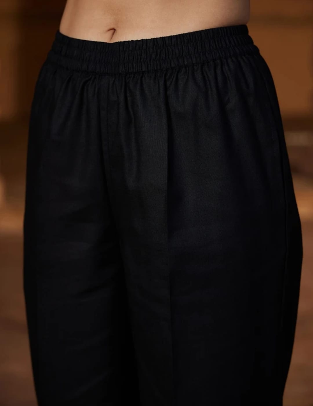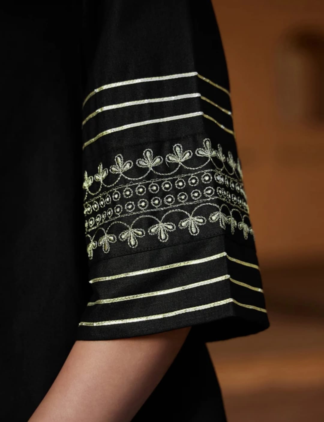 Tritiyaa Black Cotton Slub Co-Ord Set | Embroidered Sleeve Kurti with Pants | Elegant Ethnic Wear
