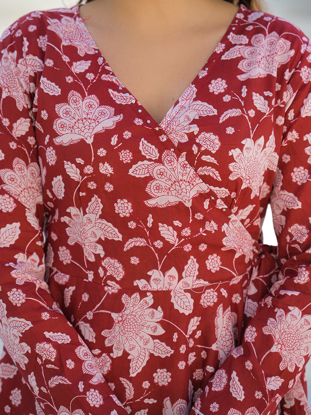 Tritiyaa Red Printed Cotton Anarkali Kurta with Trousers | Angrakha Style Kurta Set